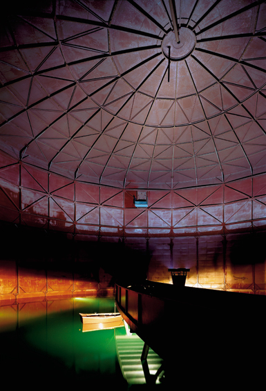 An diesem Punkt begannen die zuerst unüberwindbar scheinenden Hindernisse den Weg zu einer neuen Lösung zu öffnen. Der entscheidende Gedanke war, den Gasometer nicht als Gebäude, sondern vielmehr als Maschine zu betrachten. Warum sollte eine Maschine wie dieser Gastank zu einer Halle werden? Es muss wohl sein, dachten wir plötzlich, dass sich dieses mechanische Meisterwerk gegen eine Degradierung zu einer simplen Halle wehrt.