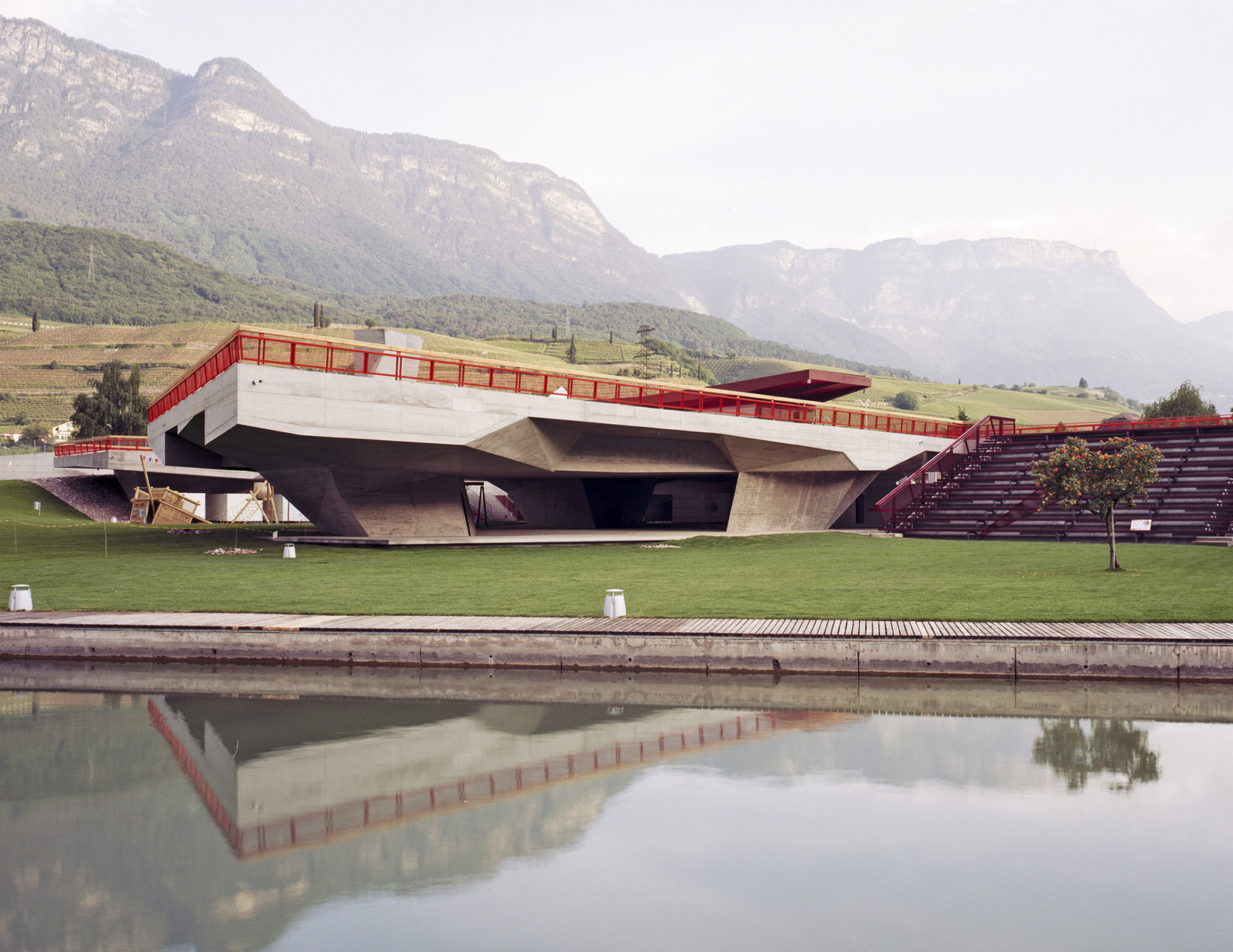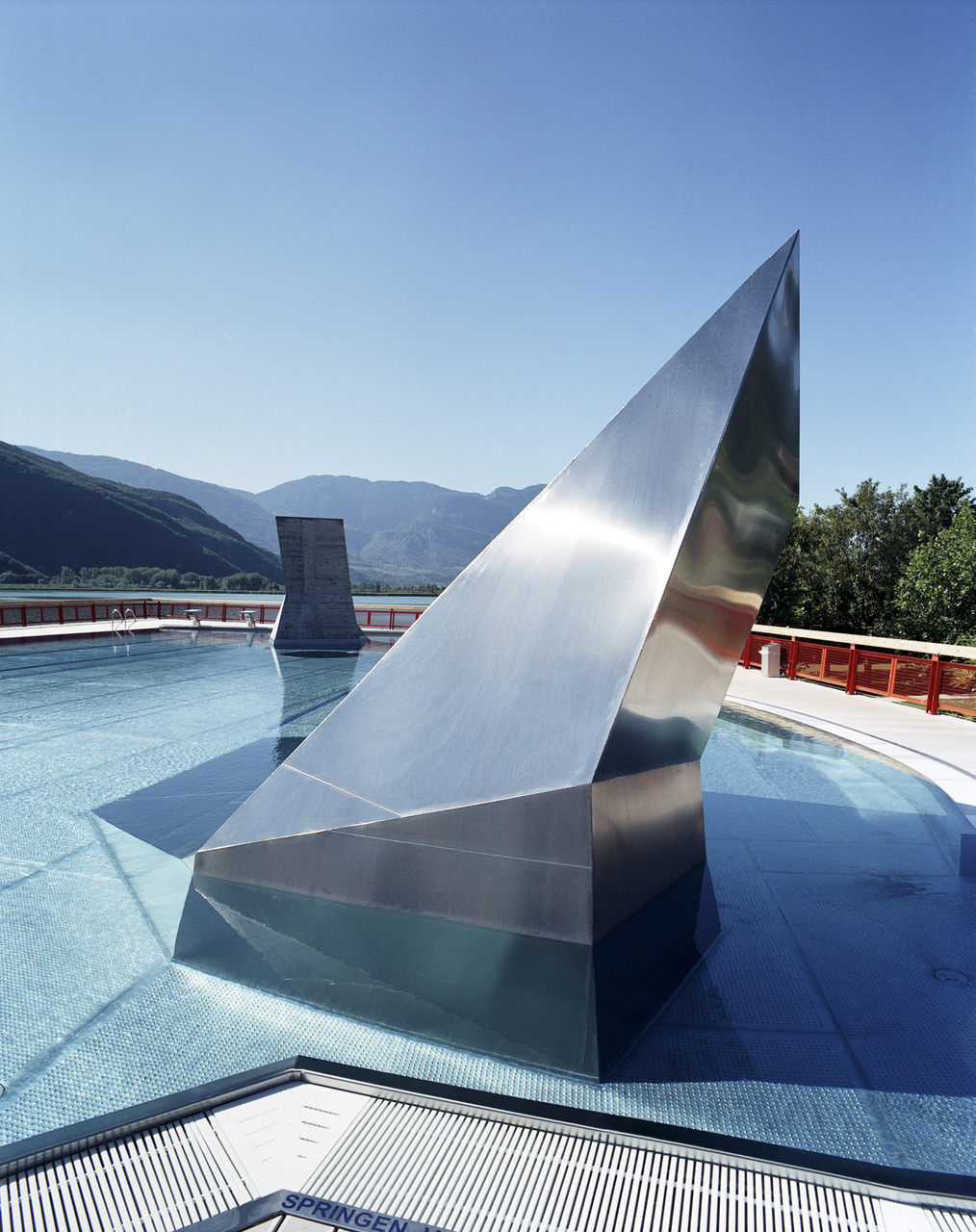 Beton derart zum Tanzen bringen, wie es hier mit der Beckenkonstruktion vorgeführt wird, ist konstruktiv keine geringe Leistung. Das statische Konzept für das Tragwerk stammt vom Wiener Büro der Ingenieure Bollinger und Grohmann, die Tragwerksplanung von Bergmeister und Partnern aus Vahrn. Die Herstellung von Stahlbeton für Formen dieser Komplexität gleicht dem Gießen einer Skulptur, bei dem genau geplant werden muss, wie beim Einbringen des Betons die Luft aus den spitzen Winkeln der Gussform entweichen kann und welche Betonmischung für welchen Abschnitt die richtige ist. Die Ingenieure haben das Anliegen der Architekten, das Erscheinungsbild eines homogenen Gusskörpers zu erzeugen, bis ins Detail mitgetragen. Die Schalung ist perfekt, die Kanten scharf, und kein Spannanker hat Spuren des Herstellungsprozesses in der Oberfläche hinterlassen. Die Betonkörper enthalten Hohlräume, in denen die aufwendige Technik für die Versorgung der Becken untergebracht werden konnte.