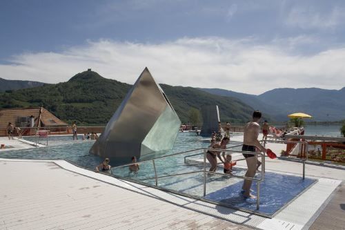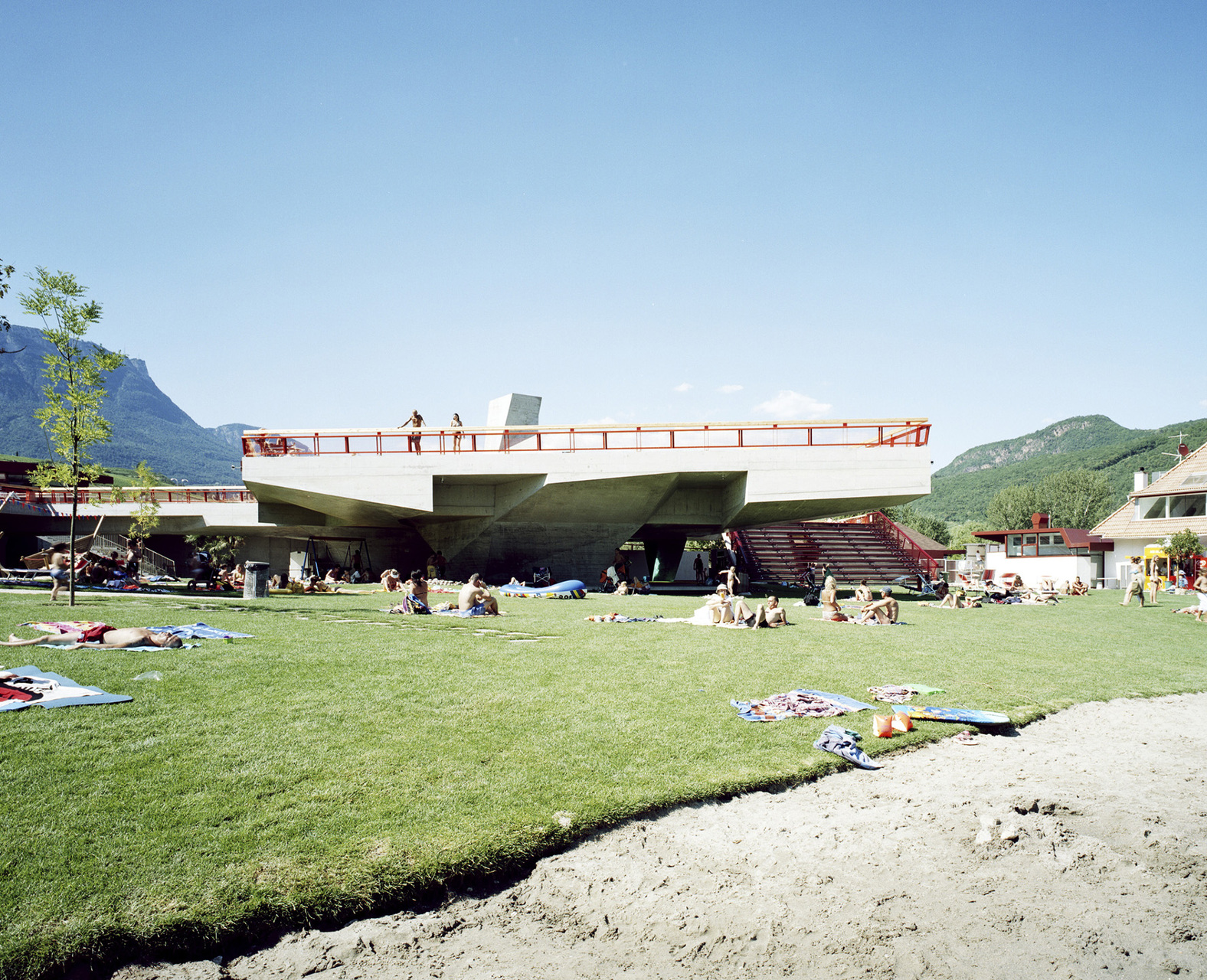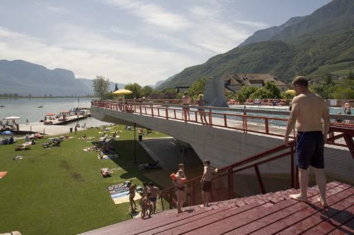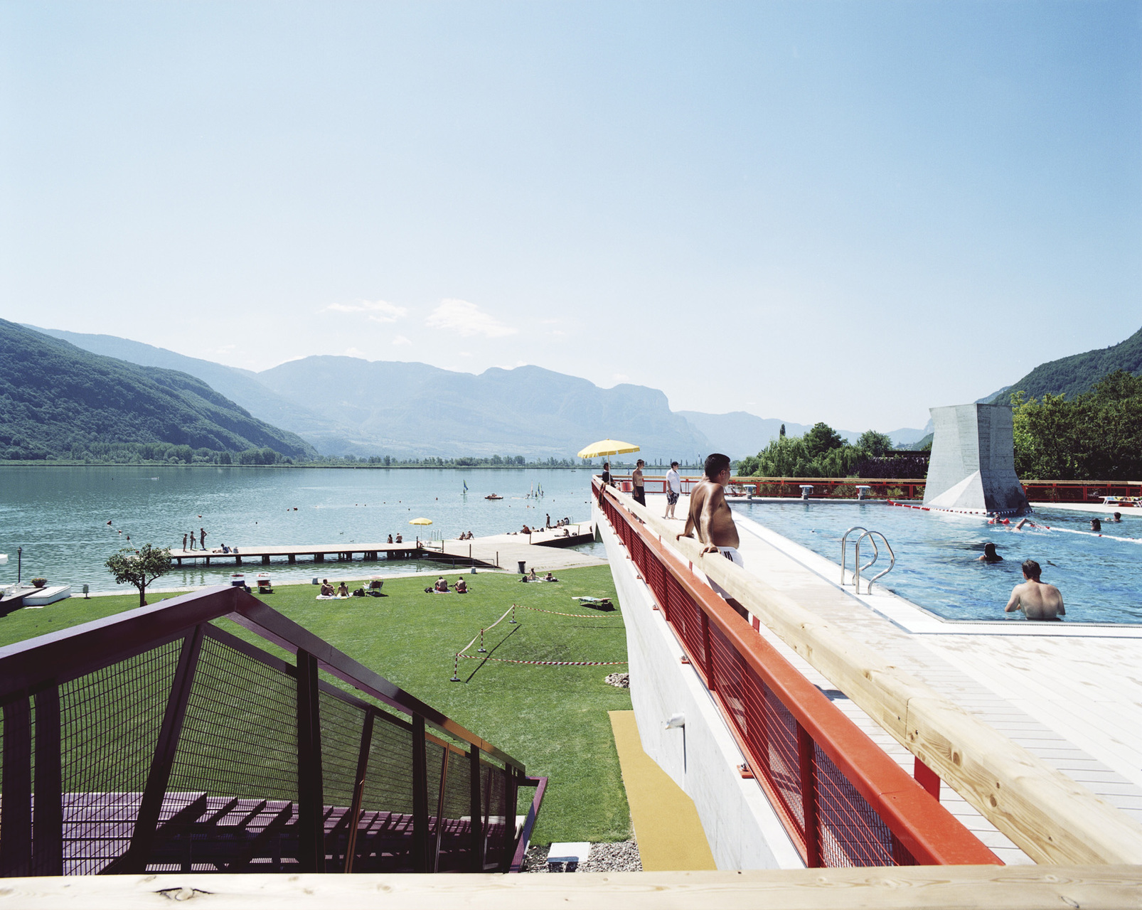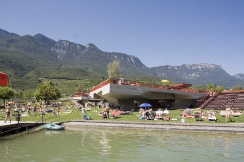 Sicherlich hätte man das alles auch viel einfacher haben können, wie unzählige Freibäder beweisen, die aus nichts anderem bestehen als aus einem im Boden eingelassenen Becken und einer Baracke für die Umkleidekabinen. Aber es hängt wohl mit dem liebevollen Umgang mit der Landschaft zusammen, mit der über Jahrhunderte gewachsenen Kultivierung des Raums, dass man sich hier nicht mit einer solchen Lösung zufrieden geben wollte. Das Freibad ist in Kaltern nicht das einzige Beispiel dafür, dass diese Kultivierung nicht in der guten alten Zeit abgeschlossen wurde. Schräg gegenüber findet sich das grandiose Seehotel Ambach von Othmar Barth aus dem Jahr 1973, und in den letzten Jahren hat sich Kaltern mit dem Manincor-Weingut von Walter Angonese, Rainer Köberl und Silvia Boday, dem Weinhaus Punkt von Hermann Czech und dem Weincenter der Kellerei Kaltern von feld72 zu einer ersten Adresse für Architekturinteressierte entwickelt.