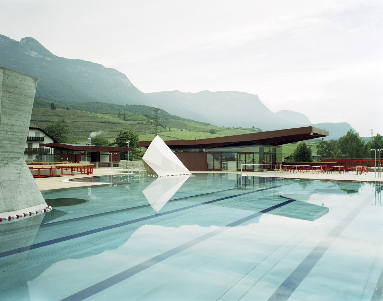 Technisch komplex, formal ambitioniert: ein Schwimmbecken als schwebende Betonskulptur. Das Freibad im Südtiroler Kaltern - von den Wiener Architekten Marie-Therese Harnoncourt und Ernst Fuchs.