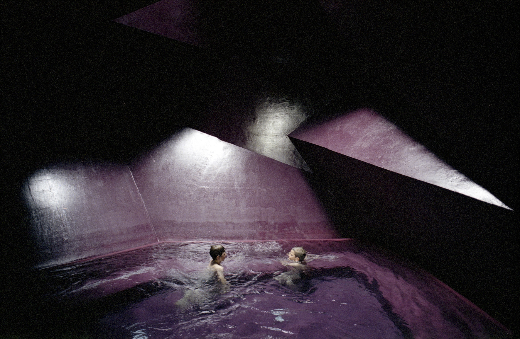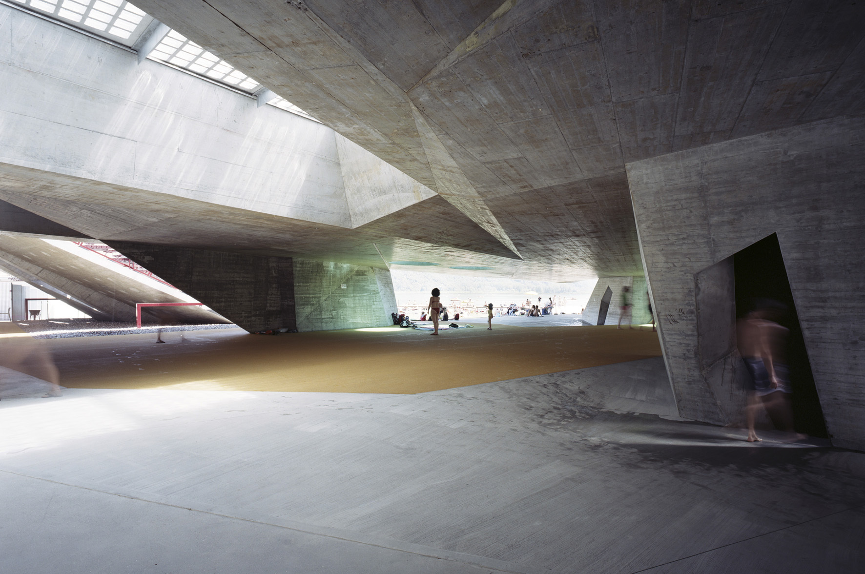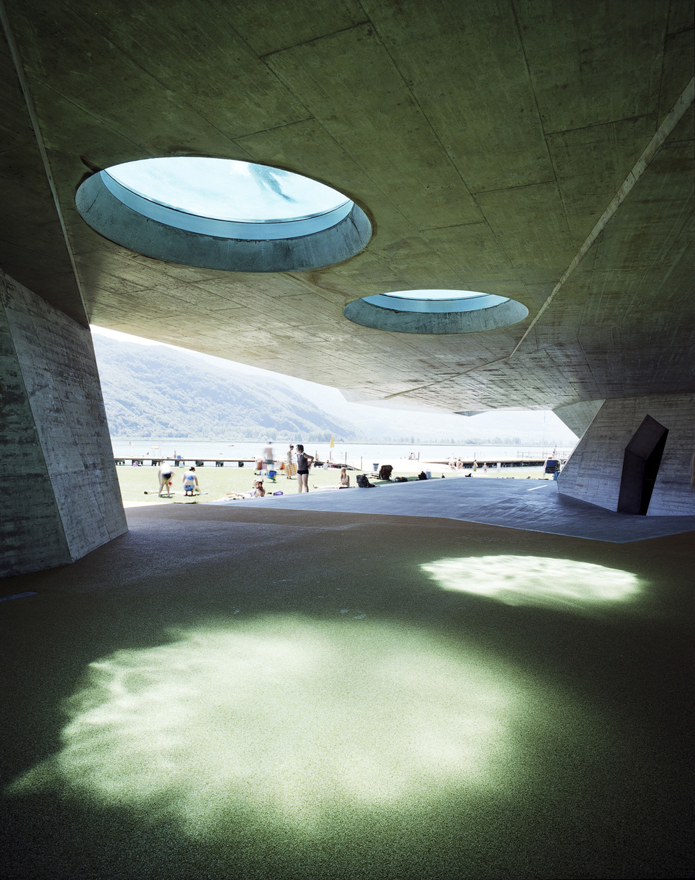 So einfach dieses Konzept klingt, hat es doch eine Konsequenz, aus der next ENTERprise die Qualität ihres Entwurfs entwickelt haben. Da die Oberkante der Schwimmbecken rund fünf Meter über dem Boden liegt und dieser eigentlich nicht bebaut werden soll, stellt sich die Frage, wie man das Wasser in Schwebe halten kann, ohne den Raum darunter mit einer Stützkonstruktion zu verstellen. Die Architekten haben das gelöst, indem sie diese Konstruktion in eine Betonskulptur verwandelt haben, die nur an wenigen Stellen aus dem Boden herauswächst, das Gewicht des Wassers aber mit weit ausladenden Gesten auffängt. Besonders beeindruckend sind die Räume unter den Schwimmbecken mit ihren präzise gefalteten Decken. Zwei verglaste, kreisrunde Öffnungen im Boden des Sportbeckens erlauben einen Blick auf die Schwimmer und bringen zusätzliches Licht nach unten. Weitere Verbindungen zur Oberwelt öffnen sich aus den kleinen Räumen, in denen der Whirlpool und ein „Regenraum“ mit Wasserspielen untergebracht sind. Sie verengen sich trichterförmig nach oben und durchdringen die Wasseroberfläche, wo sie wie Inseln aus dem Wasser aufragen. Mit Edelstahl verkleidet, wirken sie wie kleine Modelle der Bergspitzen in der Umgebung.