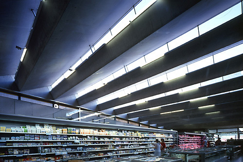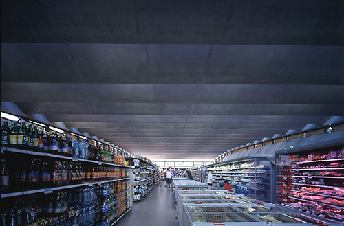 Ein Betonskelett überspannt in markantem Bogen die große Halle des Innenraums und mündet im Südwesten in einen offen Raumwinkel. Die shedartige Oberlichtkonstruktion holt eine Fülle an sonnenfreiem Zenitallicht in den Innenraum und ermöglicht von jedem Punkt des Marktes aus fragmentierte Aussichten auf die umgebende Bergwelt. An der Nordostseite des Gebäudes bietet eine Glasfläche zur Orientierung ungehinderte Aussicht auf die Nordkette und die Mieminger Berge.