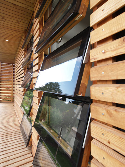 Oben vom über Eck verglasten Podest blickt man aus luftiger Höhe am Vordach entlang über Nadelbäume zum Eingang hinab, ein Nur-Glas-Eck schenkt dem Elternschlafraum Licht und Panoramablick über ganz Wien, ein Lärchenwandteil im Osten gibt Kästen Halt und Betten Schutz, dazwischen sind horizontale Lüftungsfenster zu einem raumhohen Glasstreifen übereinandergereiht. Das Kinderzimmer im Süden hat am Lattenzaun seinen eigenen gedeckten Spezialbalkon.