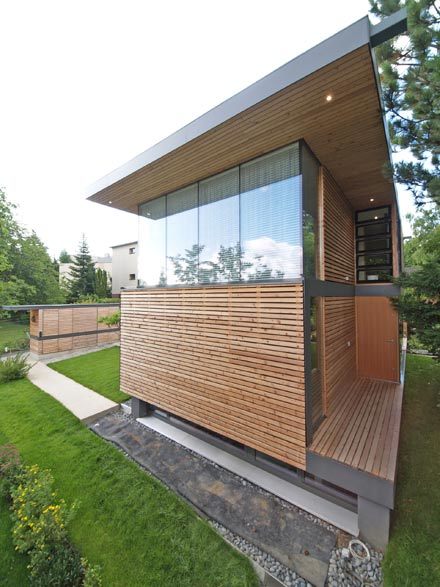 Die quälende Sorge, auf 50 m² Grundfläche bei 5,5 Meter Bauhöhe auf Dauer genug Raum fürs gesellige Familienleben zu finden, schwand schon beim ersten Modell von Architekt Christian Prasser. Über der taghellen Dichtbetonwanne des Kellers für Sauna und Büro entwarf er ein Haus in Leichtbauweise mit massiven, auskragenden Holzdecken, von feinen, horizontalen Lärchenlatten und einem Vordachband raffiniert plastisch strukturiert.
