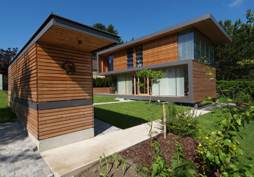 Als vornehm Eternite-gefasstes Gestaltungselement mit Mehrwert durchzieht dieses Band s-förmig alle Ebenen. Erdig setzt es in der ausgedehnten Terrasse am Rasen im Osten an, schwebt weiter als gedeckter Längssaum die Wohnebene entlang, um sich dann zur lärchenverkleideten Nordscheibe hochzuknicken. Oben gleitet das Vordachband blickschützend verlattet den Südbalkon entlang, um nach einem Dreh ums Eck im himmelstürmenden Vordach zu enden, das in fünf Meter Höhe über den eingeschnittenen Eingang im Westen ragt.