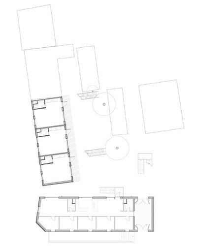 Das entlang der Straße platzierte Hauptgebäude besteht aus einem gemeinschaftlich genutzten Erdgeschoss und vier Wohngeschossen mit je 120 m². Das kleinere Volumen nimmt Bezug auf den Bestand und schließt das Ganze zu einem geschützten Hof. Jede der sechs Einzelwohnungen mit großzügiger Terrasse blickt auf den damit definierten Freiraum.
