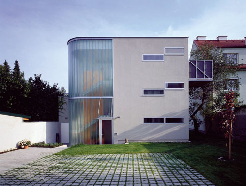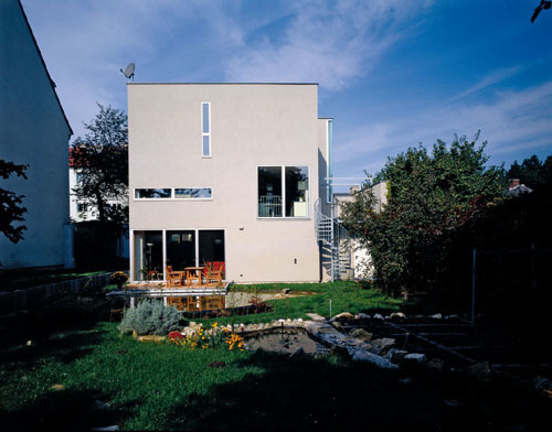 Schön fasst die rundgeschwungene Profilit-Glaswand der Stiege Hof und Haus ein. Durch das große Südwestglas im Erdgeschoss blickt die Familie in ihren privaten Hintergarten mit Biotop, das Wandeck im Osten schafft ein Intimzone, darüber ist die Wohnküche, die sich an einer windgeschützten Nische zur Westterrasse weitet, ganz oben Schlaf- und Kinderzimmer, von dessen Ostbalkon es sich gleichsam in Baumkronenwipfeln schweben lässt.