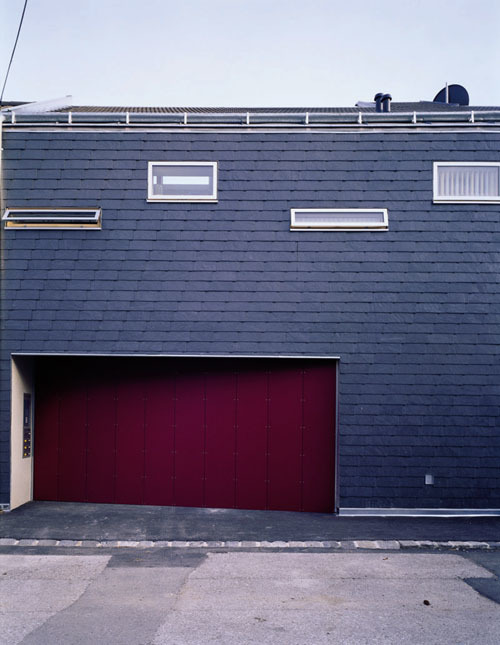 Als geräumigere Alternative bot sich die alte Post an: Hier wollten die Bauherren sich und ihren Schützlingen eine optimal auf ihre Bedürfnisse abgestimmte, neue Heimat schaffen, die sich zur finanziellen Absicherung in Wohnungen umwandeln ließ. Der Bestand war kaum belastbar, einfühlsam und sensibel planten die Architekten Koeb & Pollak statt dessen ein Doppelhaus mit großem Innenhof, das sich nahtlos in die gewachsene Struktur fügt. Das elegante Vorderhaus schenkt sechs Jugendlichen mit zwei Betreuern, das Hinterhaus mit Garten der Bauherrenfamilie bis dato nie gekannte Lebensqualität. Direkt am Hauptplatz mit Kirche und Pestsäule liegt die Rathausstraße im Herzen der Stadt: ein homogenes Gässchen aus einbis zweistöckigen Bauernhäusern und Betrieben mit großen Toren und Schaufenstern auf schmalen, tiefen Parzellen. Das Therapiezentrum ruht auf den Kellern der alten Post, deren Gewölbe eine ideale Party-Location abgeben. In selbstverständlicher Eleganz füllt die fein geschuppte, dunkle Naturschieferfassade im Norden ihre Baulücke: Die bordeauxrote Einfahrt nimmt das nachbarliche Garagenthema auf, unmerklich sitzt der dunkelgraue, mittige Eingang im Schiefer, darüber umtanzen Fensterbänder und kleine Öffnungen die Traufkante, die fließend ins Eternitdach übergeht. Im Obergeschoss wohnen die Jugendlichen in vier Einzelzimmern und einer betreuten Zwei- Zimmer-Wohngemeinschaft mit Küche und Bad.