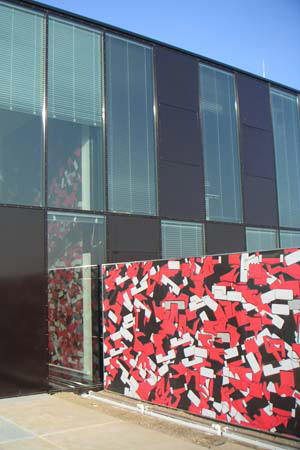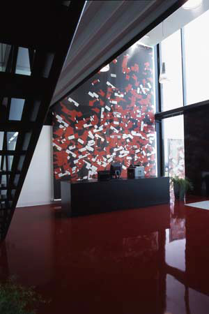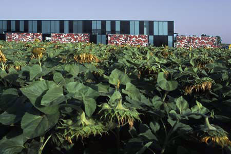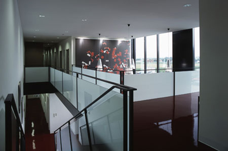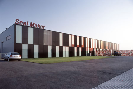 Die Südfassade des Bürotraktes in Alu-Glas-Pfosten-Riegel-Bauweise beruht auf der Variation der beiden Grundelemente Sonnenschutzglas und schwarzbraunes Aluminiumpaneel. Dieses Wechselspiel aus extrovertierter Transparenz und introvertierter Geschlossenheit sorgt im Innenraum für unterschiedlichste Raum- und Lichtsituationen, was durch die verschiedensten Jalousiepositionen noch unterstrichen wird. Die multiplen Funktionen der Raumnutzung werden raffiniert nach außen transportiert, dadurch ensteht eine spannende Kommunikation mit dem Umraum. Kontrastierend zur schlichten Eleganz der Vorderfront setzt eine grafische Werbewand, deren Gestaltungsgrundlage Produkte des Unternehmens bilden, einen formalen Kontrapunkt und damit ein zusätzliches starkes Signal nach außen. (Text: Architekten)