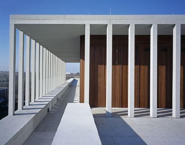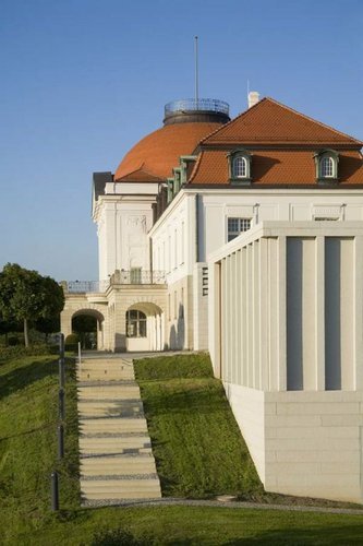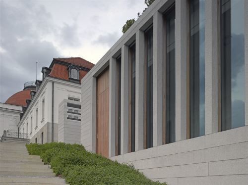 Auf gleicher Traufhöhe wie das Nationalmuseum (und dank Flachdach dennoch niedriger und zurückhaltender als dieses) nimmt das Literaturmuseum das Zwiegespräch mit seinem Nachbarn ohne Anbiederung auf. Es trumpft nicht auf und setzt dennoch einen selbstbewussten Akzent in die Landschaft. Wie das Nationalmuseum gibt sich auch Chipperfields Bau erst von der Hangseite her als zweigeschossiges Volumen zu erkennen, das sich sachte über die Geländekante schiebt. Mit zwei Flügeln und einem aufragenden, von schlanken Säulen gesäumten Mittelteil stellt es sich als eine abstrakte und luftig- leichte Variante des mit Mittelrisalit und -kuppel wuchtigen Nationalmuseums dar.