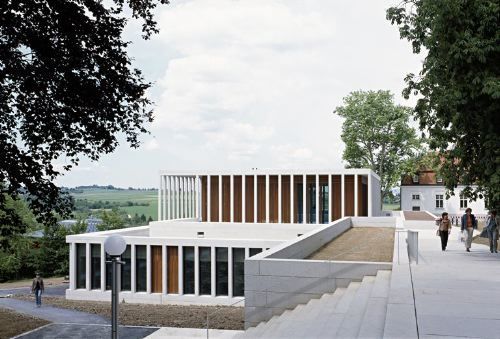Nicht allein die schwierige Topographie auf dem steil über dem Neckarufer aufragenden Hügel galt es zu bewältigen; der Neubau musste sich ausserdem in ein disparates Ensemble von bestehenden Gebäuden einfügen, von denen das tempelartige Nationalmuseum den markantesten Akzent setzte, während das 1973 gebaute Literaturarchiv und das zwanzig Jahre später hinzugekommene Collegiengebäude sowohl in ihrer Formensprache wie in ihrer Anordnung auf dem Hügel jeden architektonischen Dialog verweigerten. Ausserdem musste eine Antwort gefunden werden auf die Frage, wie ein Haus zu gestalten sei, das ausschliesslich der Präsentation literarischer Zeugnisse - kleinformatige Manuskripte, lichtempfindliche Schriftstücke, bibliophile Kostbarkeiten usw. - dienen sollte.