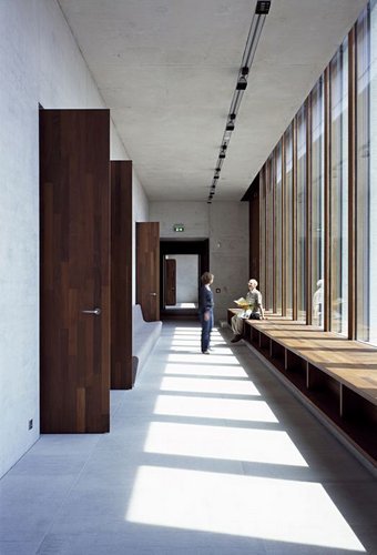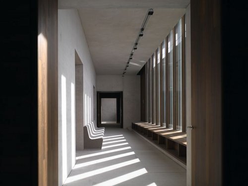 Über die neckarseitige Terrasse betritt man das Museum, das die Besucher in einem lichtdurchfluteten Eingangsbereich mit den für den Bau verwendeten Materialien vertraut macht: gepflegter Sichtbeton an den Wänden, Muschelkalk für die Fussböden, brasilianisches Tropenholz für die raumhohen Flügeltüren, grün getöntes Glas und grauer Filz für die Sitzflächen. Diese radikale Askese setzt sich fort in der reduktionistischen Formensprache. David Chipperfield hat zwar in Fläche und Höhe variierende Raumfolgen geschaffen, die ungeachtet ihrer komplexen Anordnung eine äusserste baukünstlerische Enthaltsamkeit signalisieren und eine intime Atmosphäre erzeugen.
