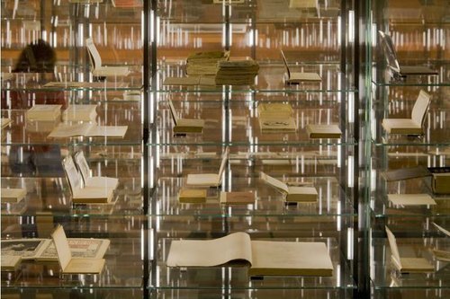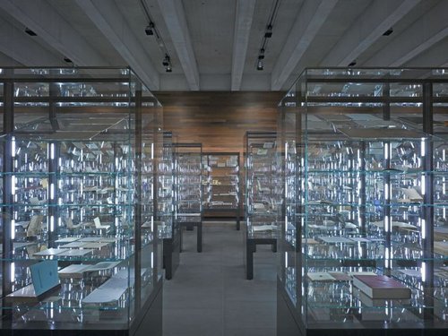 Eine breite Treppe führt die Besucher hinunter in die Ausstellungsbereiche, dabei schwindet allmählich das Tageslicht, das dunkle Tropenholz dominiert nun und dämpft die Abstrahlung. Die Wände der Ausstellungssäle schliesslich sind vollends bis unter die Decke mit dem parkettartig verleimten Holz ausgekleidet und erscheinen wie höhlenartig verdunkelte Hallen. Lediglich die Vitrinen werden wie Lichtinseln den Besucher anlocken. In drei der sechs Räume wird nun bis zur Eröffnung am 6. Juni die Dauerausstellung zur Literatur seit 1900 eingerichtet. Die übrigen drei ebenso unterschiedlich dimensionierten Säle dienen für Wechselausstellungen, in denen die Schätze aus den mehr als 1200 in Marbach gesammelten Dichternachlässen aus vier Jahrhunderten gezeigt werden sollen. Für den Juli ist eine Kabinettausstellung zu Gottfried Benns autobiografischem Text «Doppelleben» geplant, und im September folgt eine Ausstellung zu Tischbein.