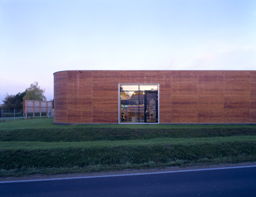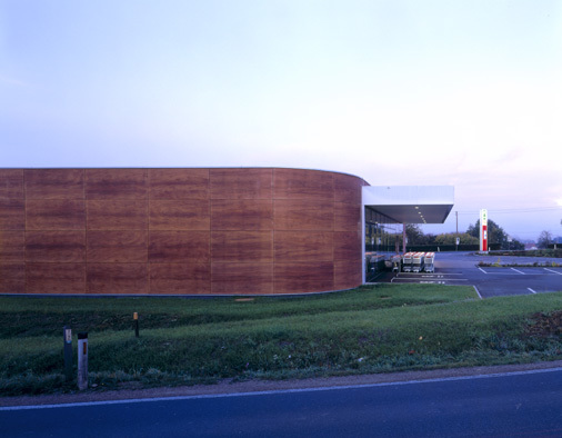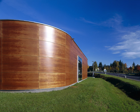 Der Verkaufsraum wird von 21 m langen Holzleimbindern stützenfrei überspannt und kann dadurch äüßerst flexibel eingerichtet werden. Die Gebäudehülle besteht aus einer hinterlüfteten Fassade in vorgefertigter Holz-Riegelbauweise. Die Bauzeit kann dadurch auf wenige Tage verkürzt werden.