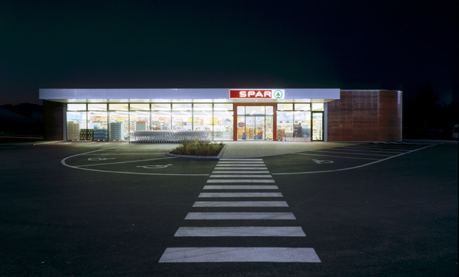 Das Gebäude in Form eines Quaders mit abgerundeten Kanten und Öffnungen an verschiedenen Seiten wird aus der speziellen Verkehrs- und Aufschließungssituation entwickelt. Der Baukörper besitzt dadurch keine „Rückseite“ und wirkt von allen Seiten attraktiv. Das markante, 4 m auskragende Vordach über dem Eingang ist zum Parkplatz orientiert und öffnet sich zum ankommenden Kunden. Auch eine zusätzliche Öffnung zur Schlierbacherstraße soll die Aktivität im Markt zeigen und das Warenangebot nach außen transportieren. An zwei Hauptfronten des Marktes ist großflächig das Logo des Marktes angebracht. Der Baukörper ist somit neben der „Spar“-Säule an der Zufahrt ein zusätzlicher Werbeträger .