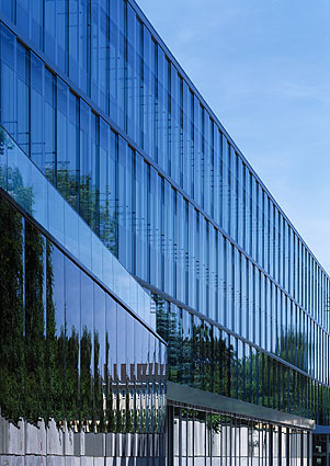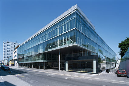 Dabei stellt die Treusch-Architektur eine regelrechte Aufwertung für das Umfeld dar. Aber das sieht man natürlich erst jetzt. Sie präsentiert sich als ausgesprochen elegantes, urbanes Statement in diesem heterogenen Umfeld. Sie fuchtelt nicht formalistisch herum, aber sie hebt sich souverän von der banalen Nachbarschaft ab: mit einer ruhigen, zweischaligen Glasfassade und der deutlich, durch einen Gebäudeeinschnitt auch als Vorplatz artikulierten Eingangszone, die quasi vom „untergeschobenen“ Baukörper eines repräsentativen Mehrzwecksaales flankiert wird.