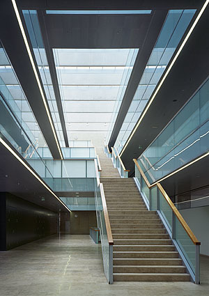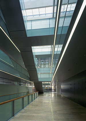 Geradezu verblüffend ist die Dachlandschaft: Sie ist sozusagen begeh- und befahrbar. Hier gibt es Einrichtungen für technische Prüfungen. Von hier sieht man aber auch, dass die Glasüberdachung der Erschließungshalle als Sheddach ausgebildet wurde. Von drinnen spürt man das überhaupt nicht. Da hat man wirklich den Eindruck einer flächigen Verglasung, der allerdings außen eine Schicht flexibler Beschattungslamellen vorgelagert ist. Jetzt, bei Schnee, stehen die Lamellen senkrecht. In der warmen Jahreszeit reagieren sie hingegen auf die Sonneneinstrahlung.