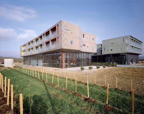 Sind die drei Farben des Hotels verfremdete Zitate von Wein, Laub und Traube? Warum ist es hier grün, hier gelb, dort aber rot? Die Ampel-Koalition wird wahrscheinlich mit der U-Form des Gebäudes zu tun haben und - Hand aufs Herz - einfärbig wäre es ohnehin langweilig geworden.