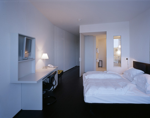 Der Rest der Zimmer ist eine zurückhaltende Mischung aus loftartiger Nacktheit und hotelöser Bequemlichkeit. Einerseits ein dumpfer, dunkler Holzboden, andererseits die rohe Wand, die nichts anderes ist als geweißter Beton. Und zwar inklusive aller Luftblasen und mangelhaft verrüttelter Stellen, an denen nun ab und zu ein schlecht vermengter Kieselstein in der Wand klafft und um die Aufmerksamkeit des Besuchers ringt. Charmant, das alles gehört zum Zufall dazu.