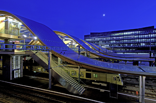 Aufgrund der zur Verfügung stehenden Bauzeit von lediglich neun Monaten wurde während des laufenden Bahnbetriebs umgebaut. Die meisten Bauteile wurden vorgefertigt und in kurzer Zeit, oft während der Nacht und teilweise zwischen fahrenden Zügen und stromführenden Leitungen, montiert. Unter diesen Umständen musste das Risiko für einen Unfall durch Stromschlag aus Sicherheitsgründen minimiert werden, weshalb man sich für eine Konstruktion aus Holz entschied.