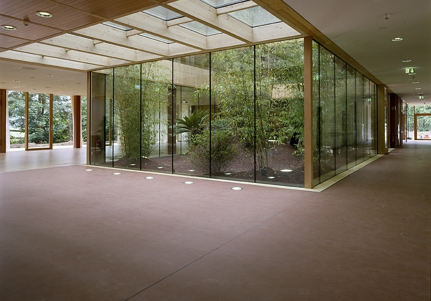 Ein abwechselndes Öffnen des Gebäudes zum Atrium lässt ein angenehmes Raumempfinden entstehen. In jedem Geschoss gibt es Terrassen nach Osten, Westen und Süden. So ist der direkte Bezug zur Umgebung, zum Park, zum Wetter und zur Landschaft von jedem Punkt gegeben. Dem Patienten wird das Gefühl gegeben in einem Hotel zu wohnen. Die Ausblicksachsen der Terrassen setzen sich im Park fort.