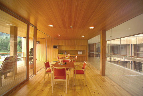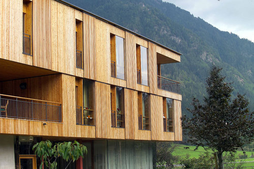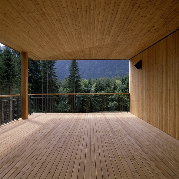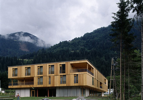 Das ganze Gebäude wird aus heimischen Hölzern hergestellt. Die Oberflächen und die sichtbaren Tragwerke aus Oberkärntner Lärche.