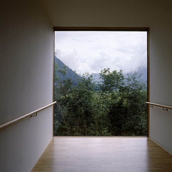 Der Baukörper und der öffentliche Park bilden eine gestalterische Einheit. Die Gebäudeöffnungen, Terrassen, Wege und Bepflanzungen nehmen aufeinander Bezug. Trotz des einfachen Baukörpers und klaren Volumens entsteht eine spannende räumliche Qualität. Die spezifische Situierung des Gebäudes – sowohl an der Strasse zum Ort als auch im Park gelegen - verleiht ihm einerseits öffentlichen Charakter - in dem es von der Strasse sichtbar ist - und andererseits größtmögliche Privatheit.