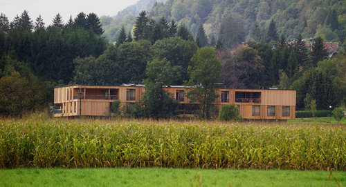 Vorgefertigte Wandscheiben leiten aus den beiden Obergeschossen die Lasten wiederum in Wandscheiben und Stützen des Erdgeschosses ab. Diese ermöglichen die Auskragung über den beiden schmalen Terrassen. Die gesamte Konstruktion ist aus Holz, außer in Situationen wo es konstruktiv nötig war auf Stahl oder Beton zurückzugreifen, wie die Liftschachtkonstruktion und an Stellen wo eine filigranere Konstruktion – Stützen im Eingangsbereich – gestalterisch bevorzugt wurden.