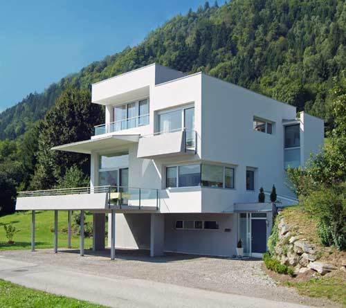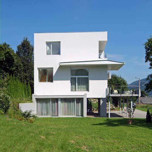 Dem Wohnraum (1.OG) wurde eine Terrasse vorgelagert, welche durch ein auskragendes Dach beschattet und von der Witterung geschützt wird. Der aufgesetzte weiße Wohnkubus wurde höhenmäßig versetzt. Dadurch wurde im Wohnraum (1.OG) eine höhere Raumhöhe geschaffen. Die vertikale Verschiebung bewirkt auch, dass ein Teil des Daches zur Terrasse für die im 2.OG angeordneten Kinderzimmer wird. Die Badezimmer für Eltern und Kinder (im Norden) wurden, Schubladen gleich, aus dem Raumverbund geschoben und durch die dadurch entstehenden Lücken belichtet (Oberlicht, Blick auf den See). Die verschobenen Wandflächen bleiben geschlossen, um sich weiterhin vom Straßenlärm im Norden abzugrenzen. (Text: Architekten)