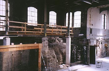 In die denkmalgeschützte Schiffbauhalle neben dem Neubau stellen die Architekten nur noch zwei der vier geplanten Baukörper hinein. Das Museumsprojekt der Stiftung für konstruktive und konkrete Kunst ist aus Finanzierungsgründen geplatzt, und das Bauvorhaben der Stahl- und Traumfabrik wurde von der Denkmalpflege nicht akzeptiert. Noch ist die Halle leer, und man kann sich den luftigen Leerraum kaum mit einem Innenleben vorstellen. Doch im Sommer 2000 werden die Besucher des Jazzklubs Moods und des turmartigen Glas-Restaurants, von dessen oberster Etage man einen Blick aus der Halle heraus und über das Areal haben soll, der Halle Leben einhauchen. Die Lücke, welche die beiden nicht realisierten Projekte hinterlassen haben, füllt ein weiterer offener Theaterraum. Er soll aushelfen, wenn die Kapazität des Off-Theaters nicht mehr ausreicht. Letzter Bauteil in dieser komplexen Baustelle ist der dunkle Betonturm, der am Ende aus der Schiffbauhalle herausragt. Hier stapeln sich die Büros und Ateliers der Gruppe Schnittpunkte.