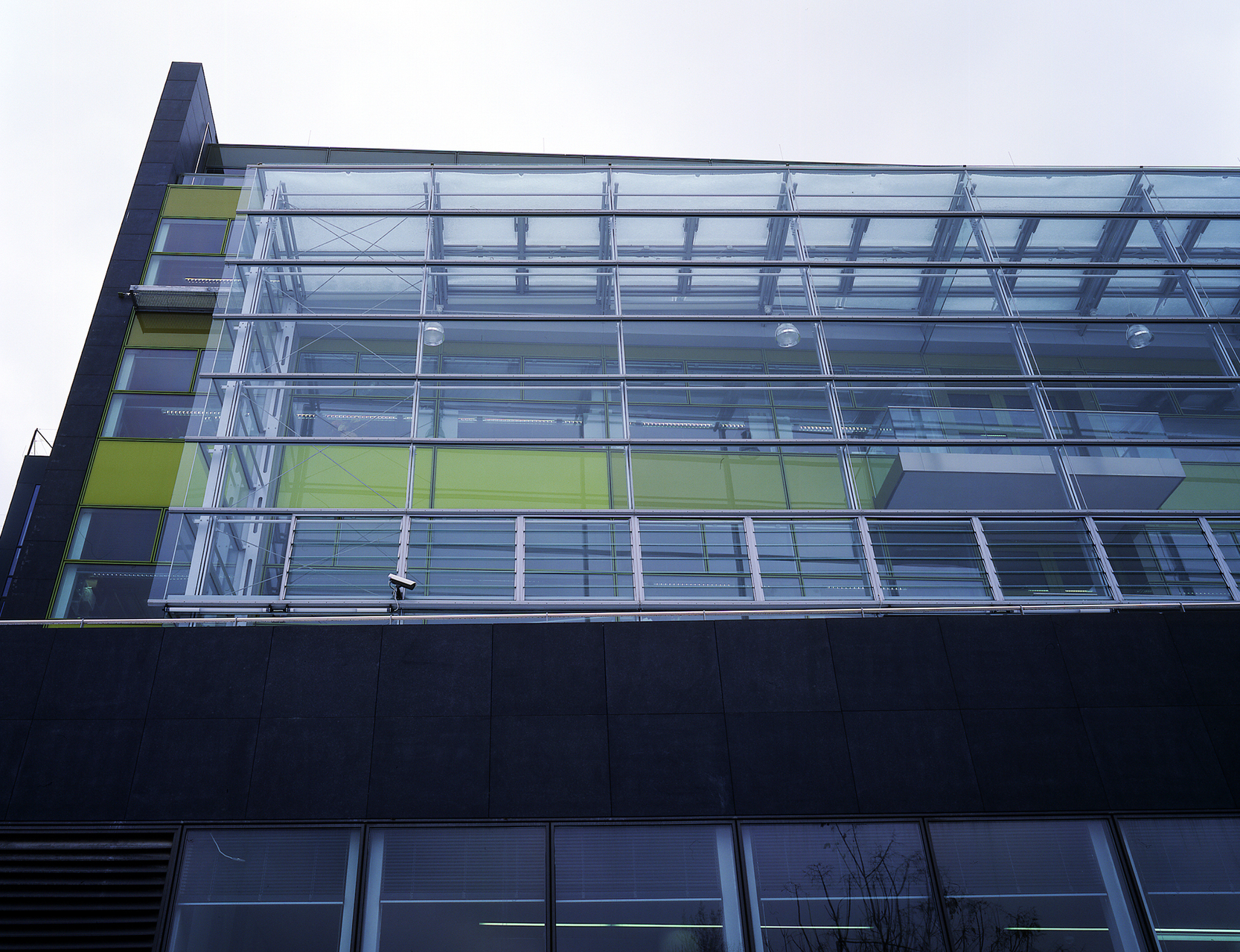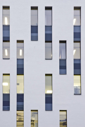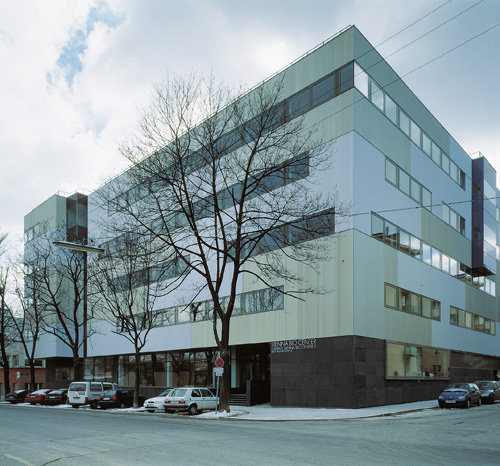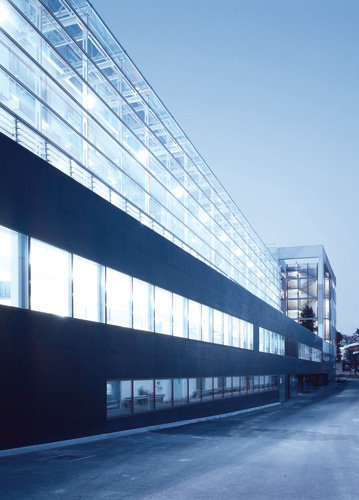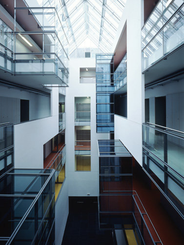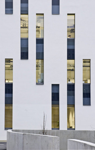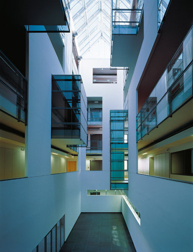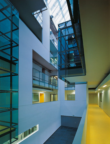 Doch vorerst muss man sich mit den beiden Neubauten begnügen, deren Fassaden wenig vom Innenleben preisgeben, auch wenn sie im einen Fall in Stein mit unterschiedlich bearbeiteten Oberflächen, im anderen Fall aus plissiertem und eloxiertem Aluminium bestehen. Diese Oberflächen wirken belebend auf die langen Fassaden, hinter denen sich Büros und vor allem Labors befinden. Räumlich interessant wird es allerdings überraschenderweise im Inneren der Gebäude. Das „Biocenter 2“ weist einen hohen Lichthof auf, in den erkerartig verglaste Aufenthaltsbereiche vorstoßen und den Raum plastisch aktivieren. Eine expressive Farbigkeit unterstützt die Raumwirkung. Junge Firmen der Biotechnologie machen hier ihre ersten selbstständigen Schritte.