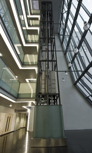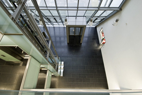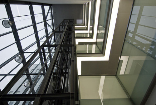 Quer zu dieser Ordnung durchstoßen auf jedem Geschoß drei Gänge das Gebäude und münden in Balkonen, die in den Wintergarten hineinragen, von wo der Blick auf einen alten, zur Absiedelung vorgesehenen Industriebetrieb fällt, wo sich in Zukunft der Gartenhof des Campus befinden wird. Diese Quergänge unterscheiden sich in der Art und Weise, wie sie zu den Vertikalräumen in Beziehung stehen, und stützen mit ihrer Transparenz die Orientierung im Gebäude. Das rationale System weist eine Struktur ähnlich jener einer römischen Gründungsstadt auf, mit Cardo und Decumanus, welche die Insulae der Labors gliedern, das Ganze gestapelt auf mehreren Ebenen. So viele, dass man die Übersicht verlieren würde, sind es nicht, und ein paar wesentliche, architektonisch aufgeladene Elemente unterstützen die Ortung.