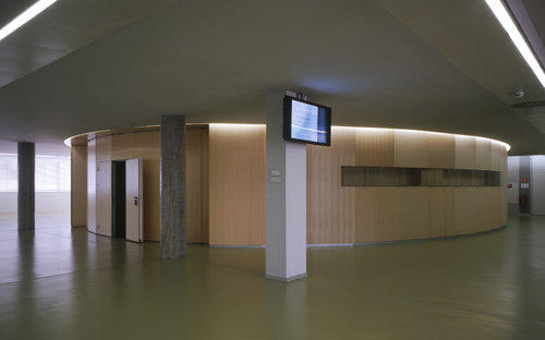 Das Erdgeschoß weist als Besonderheit einelliptisches Auditorium mit knapp 130 Plätzen auf, dessen ausgezeichnete Akustik auf elektronische Verstärkung locker verzichten kann. Die innen und außen geschuppt angebrachten Tafeln sind mit Eschenholzfurnier versehen und machen den Großraum als eingefügten Leichtbau erkennbar, seine starke Form wird von den Stülpungen relativiert. Rationalität und feines Gefühl sind an diesem Bauwerk gut ausbalanciert, obwohl die Anmutung der Labors und jene der allgemeinen Räume weit auseinanderliegen. Doch gerade aus dieser Spannung gewinnt das Bauwerk seine die nackte Funktionalität übersteigende architektonische Qualität.