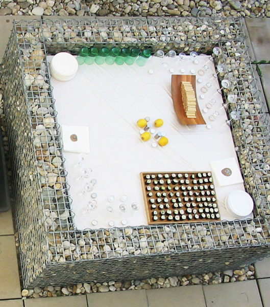 Luftdurchlässige Steinkörbe, Gabionen, lassen die Garagenentlüftung, die über die Terrasse läuft, verschwinden. Die Gabionen werden etwas hochgezogen, sodass sie einen neuen Raum fassen: Die so entstandene Fläche kann als zusätzlicher Pflanztrog oder als Schildkrötengehege, als Wasserfläche, als Spielmöglichkeit oder als Tisch verwendet werden. Der Holzboden auf der Terrasse verlängert das Wohnzimmer in den Außenraum. Karin Standler