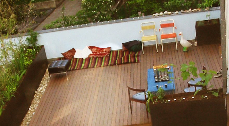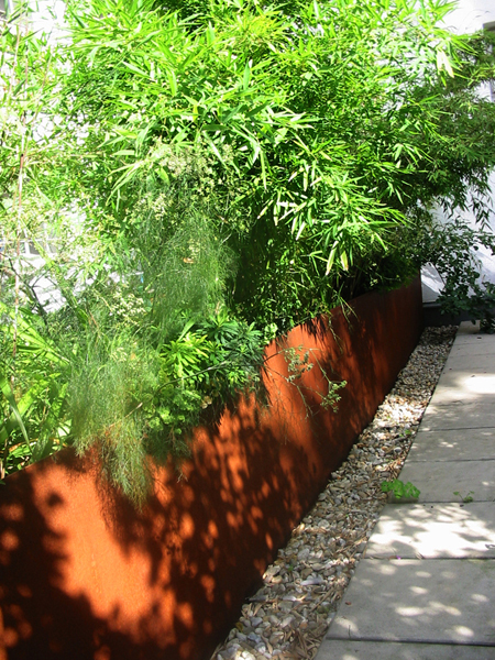 Drei Parteien mit Anteil an der Terrasse eines Jugendstilwohnhauses in Wien haben sich zu einem Gemeinschaftsprojekt zusammengeschlossen. Es war ein Design gefordert, das eine Trennung der Privatbereiche erreicht, jedoch die Terrassenlandschaft in ihrer Gesamtheit wahrnehmen lässt.Zwei 70 cm hohe Pflanztröge aus 4 mm Cortenstahl wurden angefertigt; in einem Stück führen sie knapp 15 m lang über die Terrasse. Die metallurgischen Eigenschaften dieses rostträgen Stahls bedingen die oberflächliche Oxidierung und führen so zu besonders witterungsbeständigen und langlebigen Trögen. Durch die Rostschicht wird die Oberfläche braunorange, die im Kontrast mit den Grüntönen der Bepflanzung steht. Eine Trogseite bleibt im Urzustand – schwarz-grau – dies wird durch das Einlassen mit Leinöl erzielt. Der Trog erscheint daher für eine Partei in rostbraun-orange und für die andere dunkel-metallig. Die Tröge dienen sowohl als Sichtschutz als auch als Grenzmarkierung.