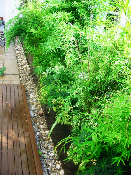Als Leitpflanze fungiert immergrüner Bambus in Kombination mit Hortensien und japanischem Zierahorn, die Leichtigkeit und zugleich Sichtschutz bieten. In jahreszeitlicher Rhythmik wird er mit Zierfenchel, Wolfsmilch, Taglilien, Schwertlilien und duftenden Rosen in den Farben Weiß, Orange und Rot ergänzt.