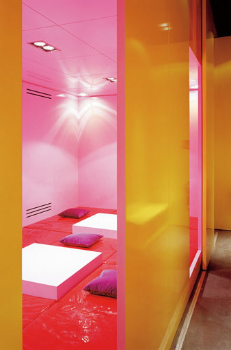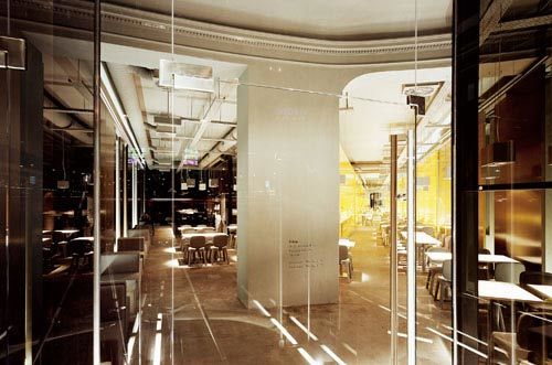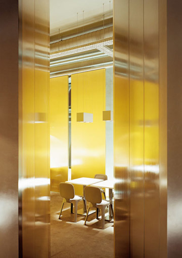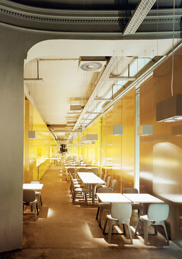 Räumliche Specials wie ein Separee zum Telefonieren mit Blick in den Gartenhof sowie ein „roter Salon“ für den Verzehr der Speisen im Liegen lassen die Bereitschaft des Auftraggebers erahnen, sich auf Experimente einzulassen, die nicht im unbedingt Kern des Gastronomischen liegen. (Text: Gabriele Kaiser)