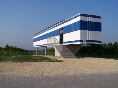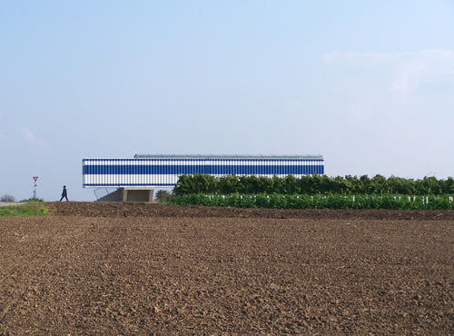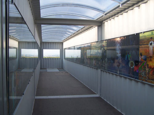 In Umkehrung zum passiven Zugpassagier geht der Betrachter beim Zwischenraum aktiv durch die Aufführungen von Landschaft, von den theatralischen Bildwelten des Frieses über die Stadtansicht von Mistelbach im Stirnfenster bis zum Horizont der Slowakei im Osten der Aussichtsterrasse. (Text: Angelika Fitz)