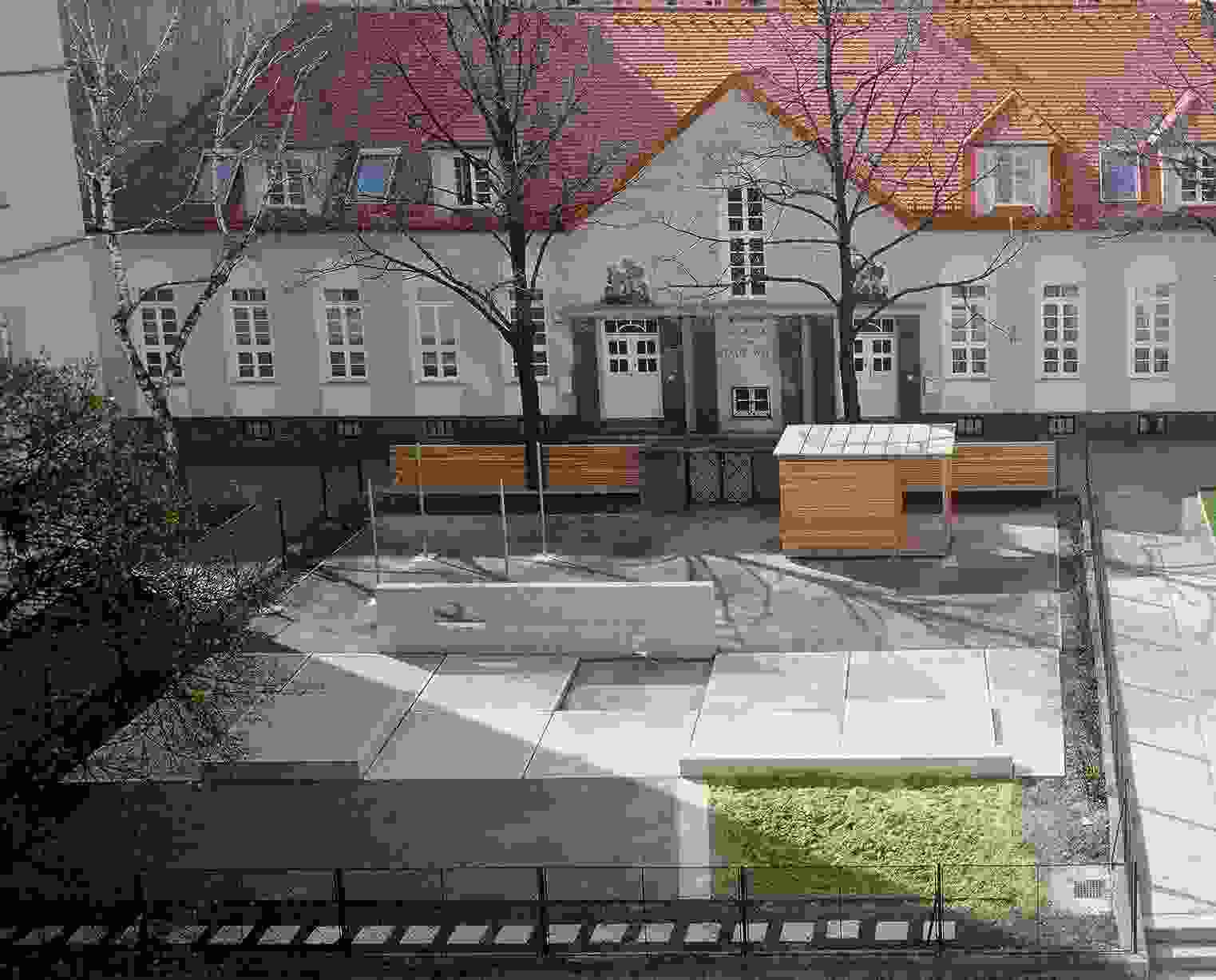 Detailüberlegungen zu bespielbaren Oberflächenstrukturen, Flächenübergängen und Materialien (Beton, Holz, Stein) ersetzen Spieleinrichtungen. Im Innenhof des Kindergartens werden die insgesamt zehn Ausgänge auf einem einheitlichen Laufsteg aus Holz eingefangen, der den Raum beruhigt und als Außenzimmer, Übergang und Spielgerät dient. Dem Holz wird eine Mondlandschaft aus Sand, Kies und Flusssteinen hinzugefügt. Ein Klettergerüst führt die Kinder in die Baumkronen. Die bestehenden raumstrukturierenden Bäume werden durch Pflanzbeete für die Kinder des Kindergartens ergänzt. (Text: Landschaftsarchitektinnen)