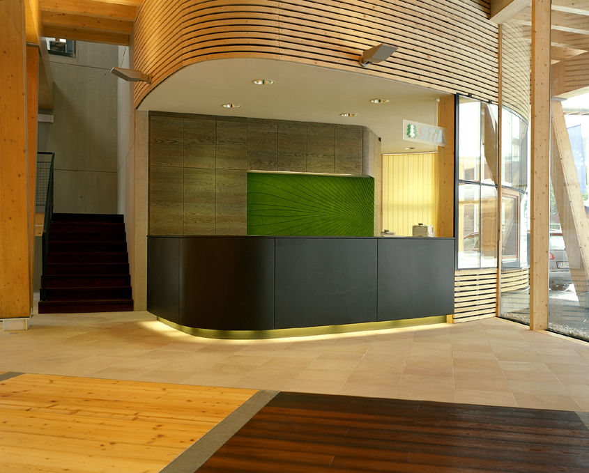 In Zusammenarbeit mit dem Statiker wurde ein innovatives, statisch optimiertes System entwickelt und der gesamte Büroteil im Ausmaß von 14 x 43 m stützenfrei ausgeführt. Durch die räumliche Einbeziehung des Tragsystems konnte eine Raumhöhe von 5 m erzielt werden, die dem Großraumbüro eine ausgewogene Proportion und Großzügigkeit verleiht. Der Unterspannträger durchzieht als Brücke den gesamten Bürotrakt und dient zugleich als Rückzugsebene.