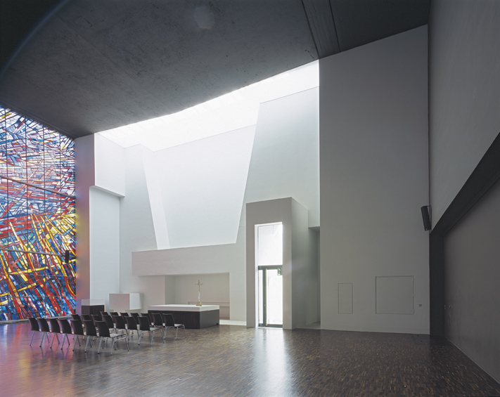 Der warm-dunkle Boden aus geräuchertem Eichenparkett verbindet sich mit der dunklen Wand zum Gemeindehaus und der dunklen Unterseite der Decke zu einem den Kirchenraum einhüllenden und das Glasfenster einfassenden Band. Es definiert einen schützenden Raum, der sich dem Licht öffnet.