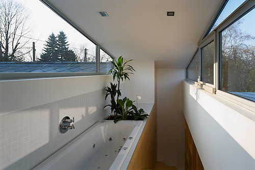 Mit eleganter Dachneigung schiebt sich der schrägverglaste Zubau über Garage und Kellergang, umfließt das Haus, fasst es neu und stellt so die in den 80ern gekippte Balance wieder her. Den Vorraumstumpf komplettiert nun ein Büro mit Durchsicht zur Lesenische im panoramaverglasten Schlafzimmer. Zwei Reihen Dachflächenfenster und eine zur Schlafgalerie versetzte Zwischendecke ließen oben ein südlichtgeflutetes Kinderparadies entstehen. Vom Schreibtisch überblickt man die Straße, dahinter führt eine gewitzte Buchenholztreppenkonstruktion aus versetzten Regalen aufs netzgesicherte Hochbett mit Extrapodest für Freunde unterm First, durchs Fenster lacht der Himmel. Zwischen Gästezimmer und Kinderbad ist ein breiter Spielflur.