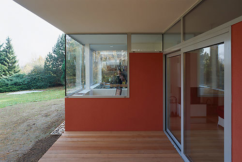 Als Oberlichtband setzt das Glas im Westen an, weitet sich zur raumhohen Scheibe, buchtet sich zum gläsernen Leseeck aus und fließt endlich ins Gartenfenster im Büro der Dame des Hauses.