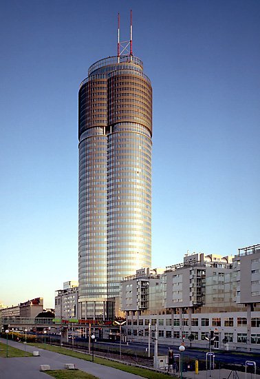 Wiens erstes Hochhaus – es überragt den Stephansdom – ist natürlich weithin sichtbar, es setzt ein neues Signal in der Stadtsilhouette. Denn richtige Hochhäuser hat es in Wien zuvor nie gegeben. Was in den letzten Jahren an der Wagramer Straße, auf der Platte, am Wienerberg entstanden ist, das waren möglicherweise hohe Häuser –Hochhäuser sind eine ganz andere Kategorie. Der entspricht das Projekt von Boris Podrecca, Gustav Peichl und Rudolf Weber –zumindest in seiner Höhe.