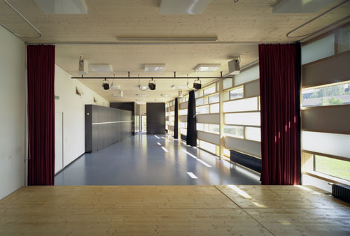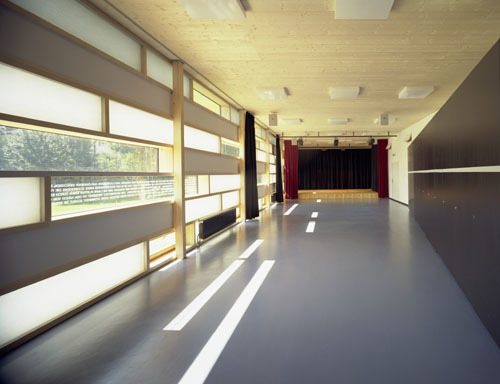 Dass die Schule den Pavillon braucht, darüber waren sich alle einig, und so schrieb die Stadt Bern einen Wettbewerb aus. Architekt Lorenzo Guetg und Erne Holzbau gewannen mit einem Pavillon, der Lage und Abmessungen vom Altbau übernimmt, doch eine zeitgenössische Sprache spricht. Die beiden Seiten und die Rückfassade des aus Holzrahmen erstellten Baus sind mit horizontalen Lärchenlamellen verkleidet. Die Hauptfassade gegen die Spielwiese ist weit gehend in Glas und in sieben horizontale Bänder gegliedert, die mit unterschiedlichen Glas-füllungen und Holz, das der raumhaltigen Glasfassade die Kraft einer soliden Wand gibt, ausgefacht sind. Rote Stoff-storen schützen den Raum vor Sonne und lassen den Holz-pavillon bei schönem Wetter wie ein Zelt aussehen.