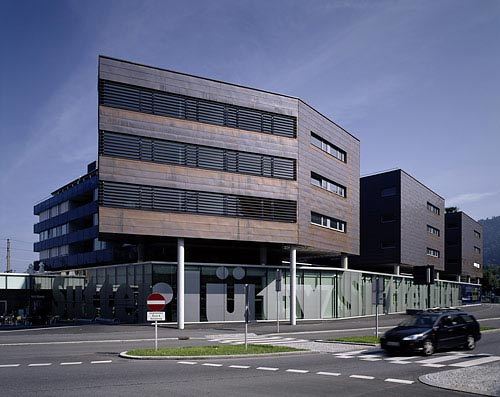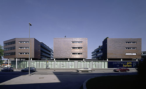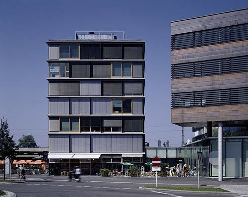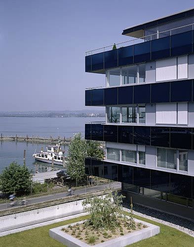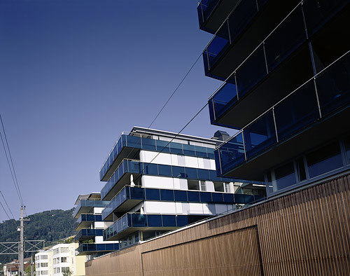 Die auf das Sockelgeschoss gesetzte Wohnbebauung ist über Laubengänge an der Nordseite erschlossen, die großen Vierzimmerwohungen wurden jeweils an das westliche Ende der drei Kämme gesetzt und sind - luxuriöses Surplus - mit großen Loggien bzw. Sonnenterrassen ausgestattet, die den Blick über den See eindrucksvoll in Szene setzen. Man darf sich in den Fernen eines Urlaubsortes wähnen und befindet sich doch inmitten der Stadt. Südlich des „Kamms“ setzt der siebengeschossige Büro-Solitär am Kreuzungspunkt von Seestraße, Reichsstraße und Anton-Schneider-Straße einen weiteren städtebaulichen Akzent. Die gläserne Front des großen Sutterlüty-Markts verbindet die drei straßenseitig mit Zinkblechen eingekleideten Wohnblöcke an der Basis, wobei sich die darüber auskragende „Nase“ des Südblocks aus dem Schwung des Straßenverlaufs ergab. Ein Ensemble urbaner Durchmischung, bei dem es gelang, inmitten von diversen städtischen Bewegungsströmen, Oasen der Abgeschiedenheit zu schaffen. (Text: Gabriele Kaiser)
