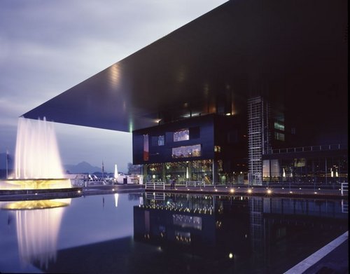 Aus der Nähe betrachtet, kommen dann aber auch die architektonischen Reize dieser Kulturmaschine zum Zug: Dunkel in Rot, Grün und Blau glühende Oberflächen wechseln ab mit Höhlungen und Vorsprüngen, mit Terrassen, Gangways und Treppentürmen. Zu diesem plastischen Gefüge gesellt sich nun als neuster Bauteil die transparente, von einem Aluminiumgitter umhüllte Glasbox des Westflügels. Unter seinem Dach wurde - gleichsam als Etagengeschäft - soeben das Kunstmuseum fertiggestellt. Wenn man vom Bahnhof kommt, betritt man diesen Bauteil nun als ersten. Hinter dem etwas geduckten Eingang explodiert die Eingangshalle förmlich nach oben, während man die räumliche Tiefe erst nach und nach erahnt. Durch Glastüren und über eine Holzbrücke, die einen der beiden ins Gebäude hineingezogenen (und dessen Dreiteilung in Kongresshaus, Luzernersaal und Konzertgebäude nachzeichnenden) Kanäle quert, gelangt man in die architektonische Staffage des eigentlichen Foyers. Durchblicke, Spiegelungen und die Vexierspiele von Licht und Material bewirken hier dramatische Effekte, verschleiern dabei aber ganz bewusst den konstruktiven Kraftakt.