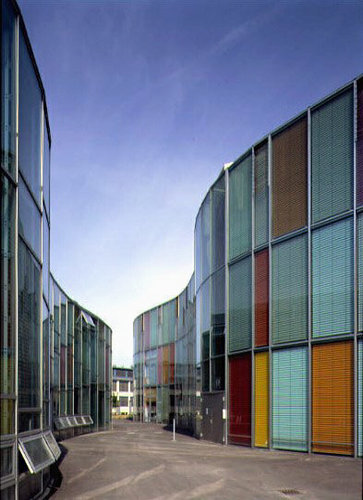Ihre beiden gläsernen Amöben kommen einer Absage an den strengen Hofrandraster gleich. Zudem erheitern sie mit ihrem Farbenspiel den historisch belasteten Ort. Der Doppelbau ist das Ergebnis eines Wettbewerbs, der - als Ergänzung der von Alfred Kraus um 1960 errichteten Forschungspavillons - vier neue Häuser vorschrieb. Der Auftrag wurde unter den bestrangierten Büros aufgeteilt, wobei für die beiden etwas dürr geratenen Kuben, die die kleine Anlage von Kraus abschliessen, das Wiener Büro Ortner & Ortner verantwortlich zeichnet. Sauerbruch & Hutton hingegen errichteten im angrenzenden Strassenzwickel zwei organische Baukörper. Deren auf den ersten Blick recht willkürlich anmutende Wellenfassaden erinnern stark an Norman Fosters frühes Bürogebäude in Ipswich und vermitteln zwischen den Kraftlinien, die hier der städtebaulichen Textur eingeschrieben sind.