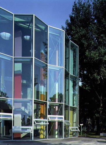 Zwei gegeneinander abgewinkelte Rastersysteme prägen denn auch die beiden durch einen unterirdischen Gang miteinander verbundenen Bauten: die eingeschossige, für Grossversuche bestimmte Werkhalle und den dreigeschossigen, in seinen Dimensionen nur schwer zu fassenden Gewerbebau. Mit seiner amorphen Form nimmt letzterer Rücksicht auf den Baumbestand und erfüllt zugleich die an ihn gestellten funktionellen Anforderungen: Der eigenwillige Grundriss und die Anordnung der farbig bemalten Doppelträger in der zweischaligen Glashülle ermöglichen unterschiedlich grosse Räume mit vielgestaltigen Bereichen - vom völlig abgedunkelten Forschungslabor über die Werkstatt bis zum lichtdurchfluteten Büro. Damit können die Wünsche der hier auf dem Gebiet der Lichttechnik forschenden Jungunternehmen auf geradezu ideale Weise erfüllt werden.