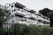 An der Strassenfassade ist die innere Aufteilung durch den alternierenden Rhythmus von Balkon- und Fensterachsen ablesbar; das Stahlskelett erlaubte es, die geschlossenen Wandflächen auf schmale vertikale Pfeilerzonen sowie auf die horizontalen Brüstungen zu reduzieren. Die Balkons sind vom Wohnbereich her zugänglich, schieben sich jedoch vor die Schlafzimmer, so dass der Wohnbereich nicht verschattet wird. Die Struktur der Gartenfassaden weicht deutlich von jener der Ostseite ab. Schmale, von Pfeilern unterbrochene Fensterbänder bestimmen die Westansicht und verweisen auf die dahinterliegenden Korridore ebenso wie auf die Sequenz der Wohnungen; die Südfront zeigt mit ihren loggienartig ausgebildeten, von schottenartigen Querwänden getrennten Balkons eine plastische Gliederung.